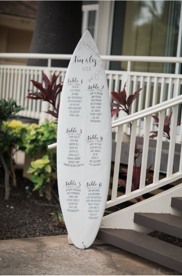 Once you choose your general preference or vibe, you have to execute the seating chart in physical form. This can be a simple board on an easel, a scroll hanging down the length of a wall, vintage window panes, you name it. One thing to keep in mind is whatever the seating chart, the table numbers or names should be visually consistent.